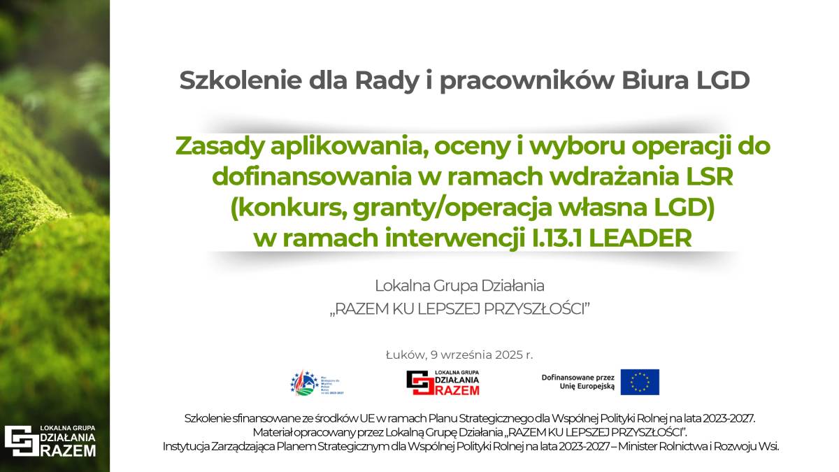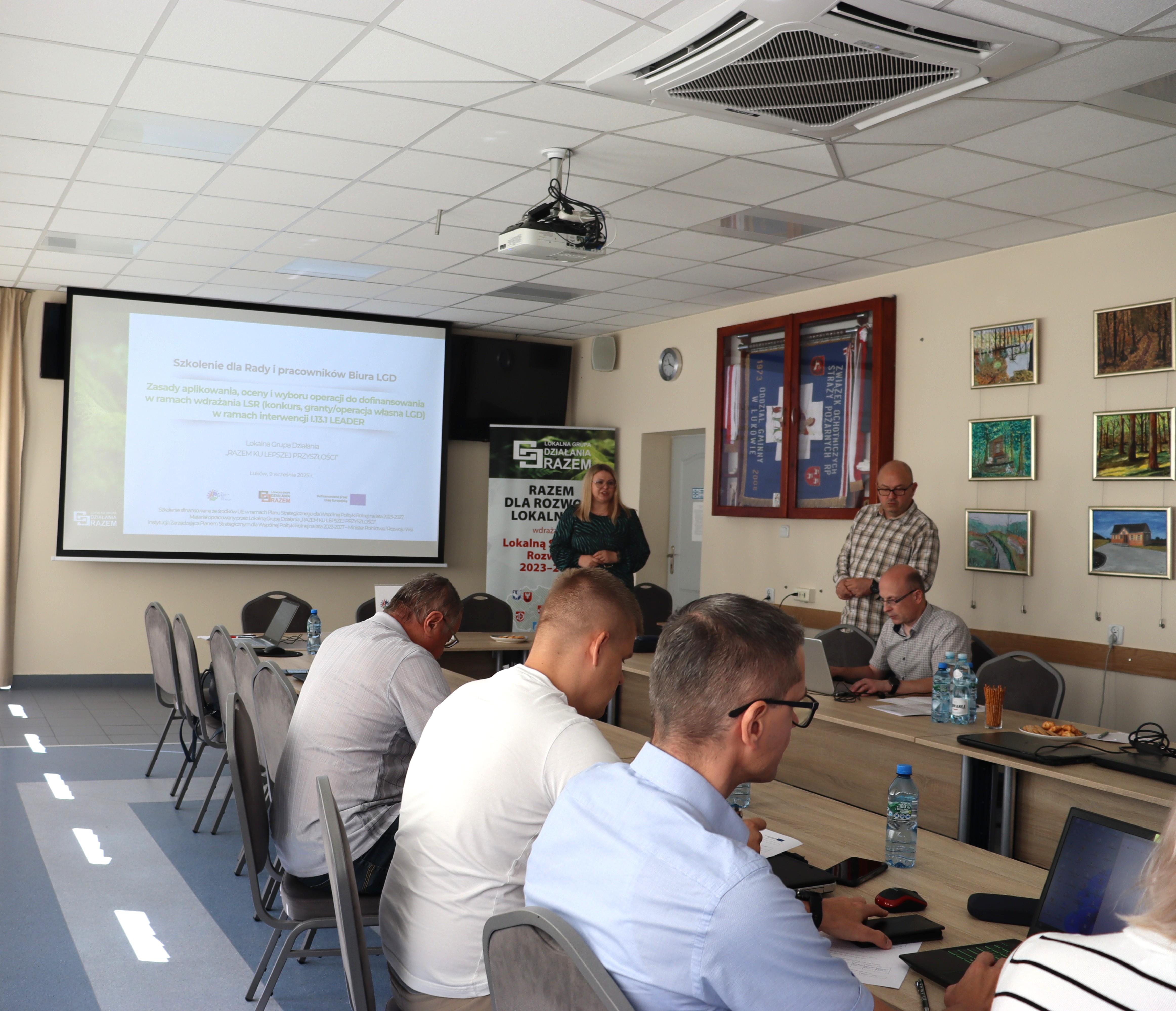 W dniu 9 września 2025 r. w sali konferencyjnej UG w Łukowie odbyło się szkolenie skierowane do członków Rady oraz pracowników Biura LGD „RAZEM”. Tematem spotkania były "Zasady aplikowania, oceny i wyboru operacji do dofinansowania w ramach wdrażania LSR (konkurs, granty/operacja własna LGD) w ramach interwencji I.13.1 LEADER".