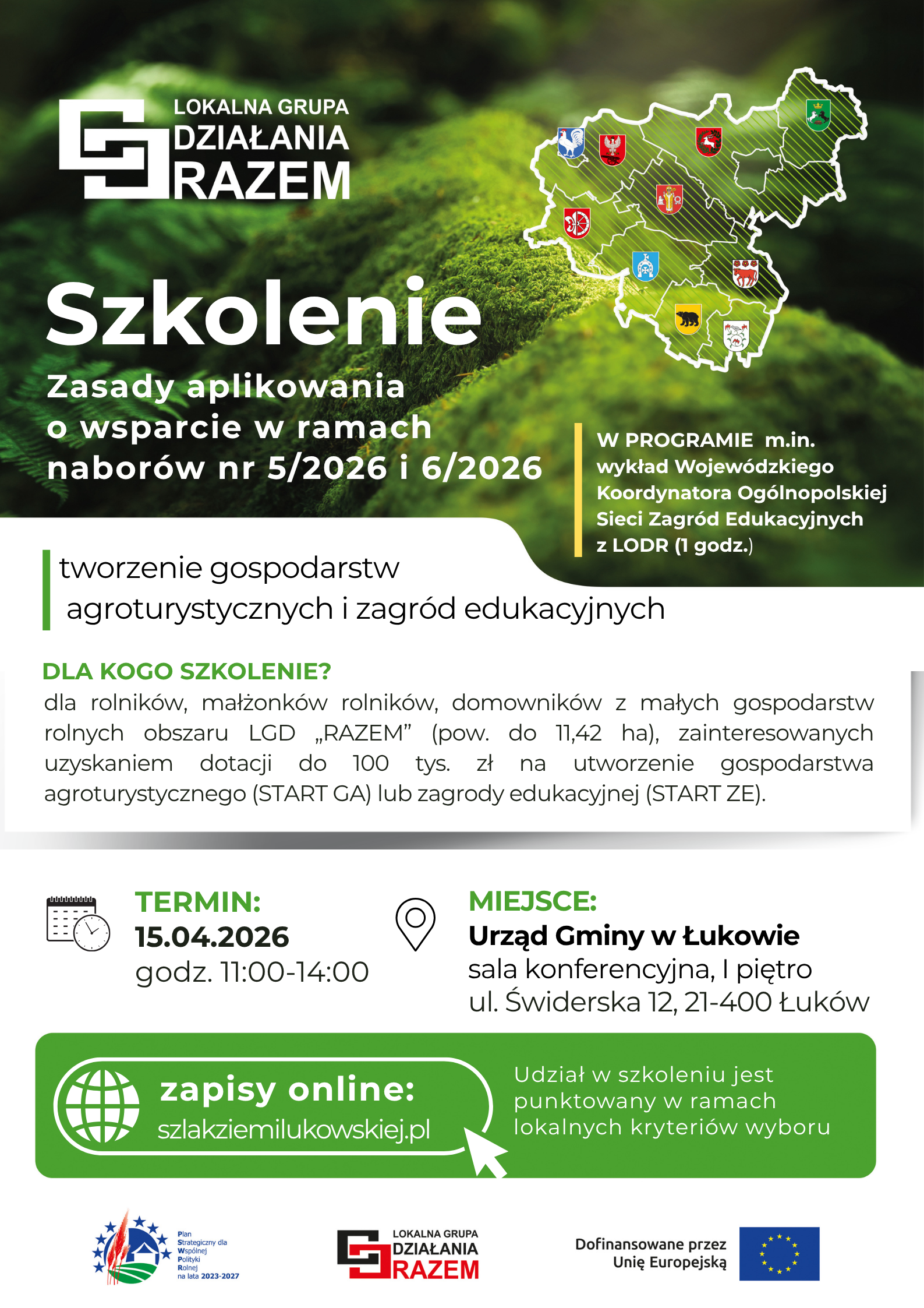 Lokalna Grupa Działania „RAZEM” zaprasza na szkolenie „Zasady aplikowania o wsparcie w ramach naborów nr 5/2026 i 6/2026”, poświęcone planowanym w maju naborom wniosków z zakresu Rozwój pozarolniczych funkcji małych gospodarstw rolnych poprzez: