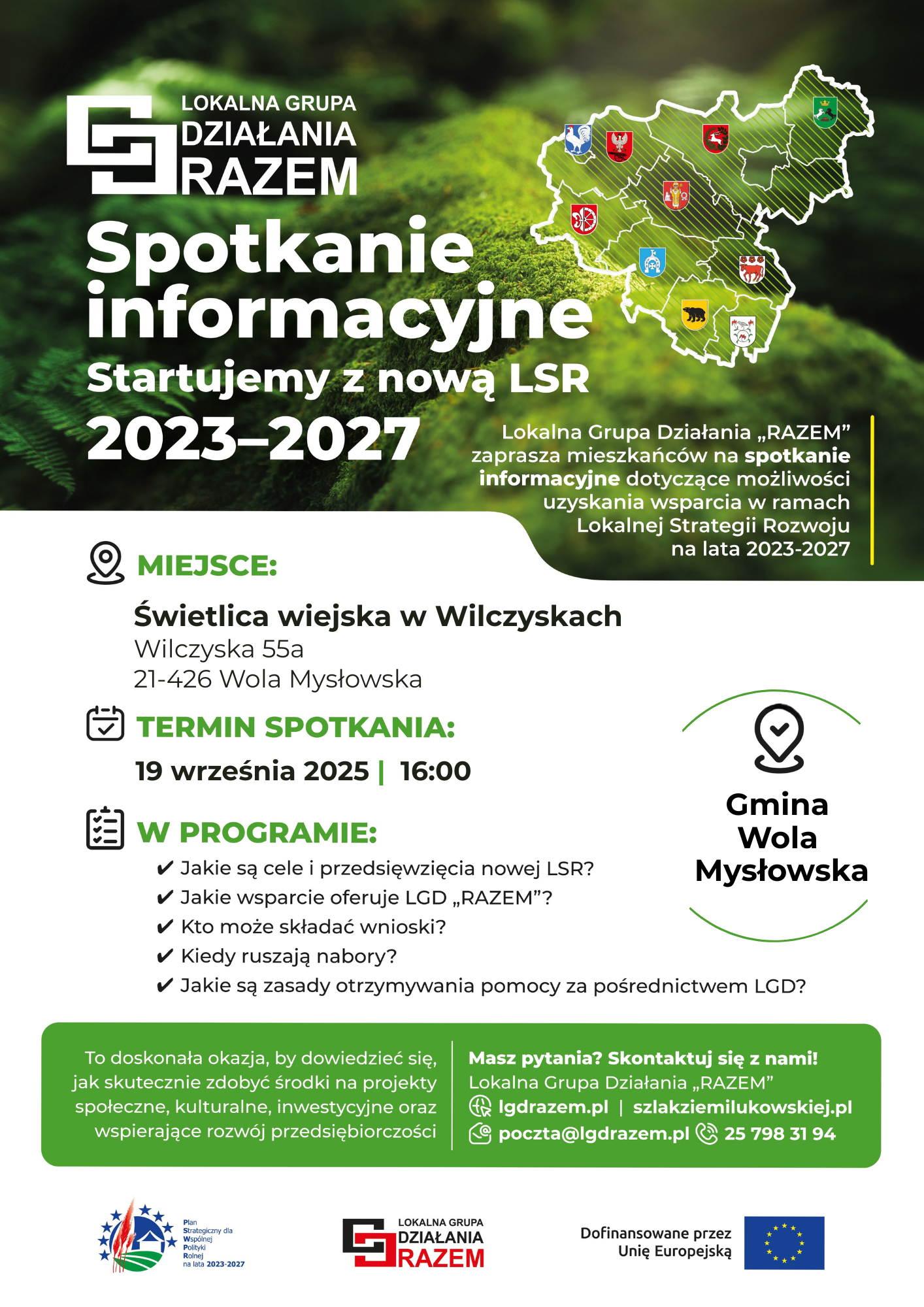Spotkanie informacyjne jest realizowane przez LGD "RAZEM" w ramach interwencji I.13.1 LEADER Rozwój Lokalny Kierowany przez Społeczność (RLKS)- komponent Zarządzanie LSR. Instytucja Zarządzająca Planem Strategicznym dla Wspólnej Polityki Rolnej na lata 2023-2027 – Minister Rolnictwa i Rozwoju Wsi.