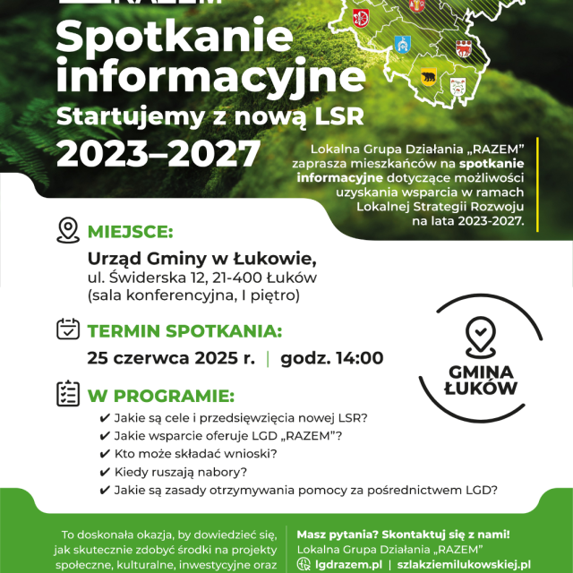 Lokalna Grupa Działania „RAZEM" zaprasza wszystkich mieszkańców obszaru LGD na pierwsze spotkanie informacyjne „Startujemy z nową LSR 2023-2027" dotyczące możliwości pozyskania wsparcia w ramach Lokalnej Strategii Rozwoju na lata 2023-2027.