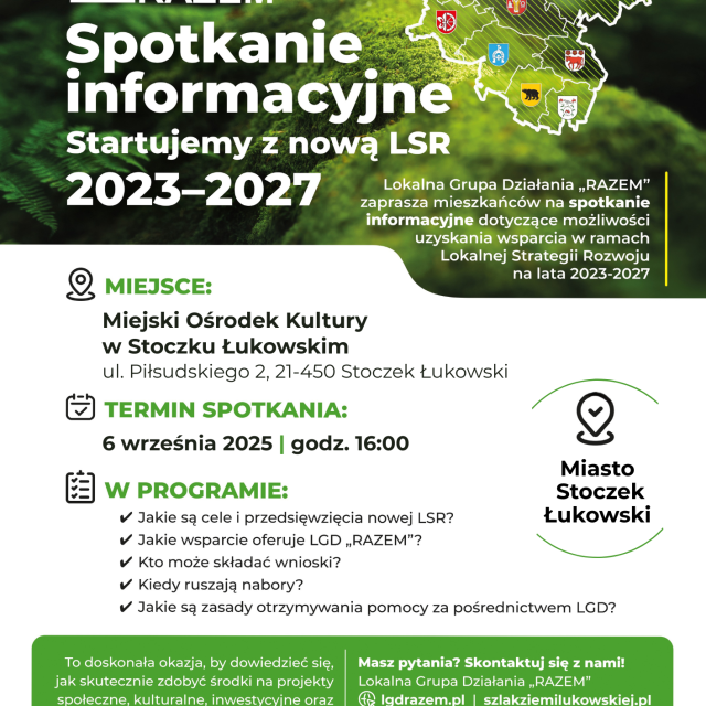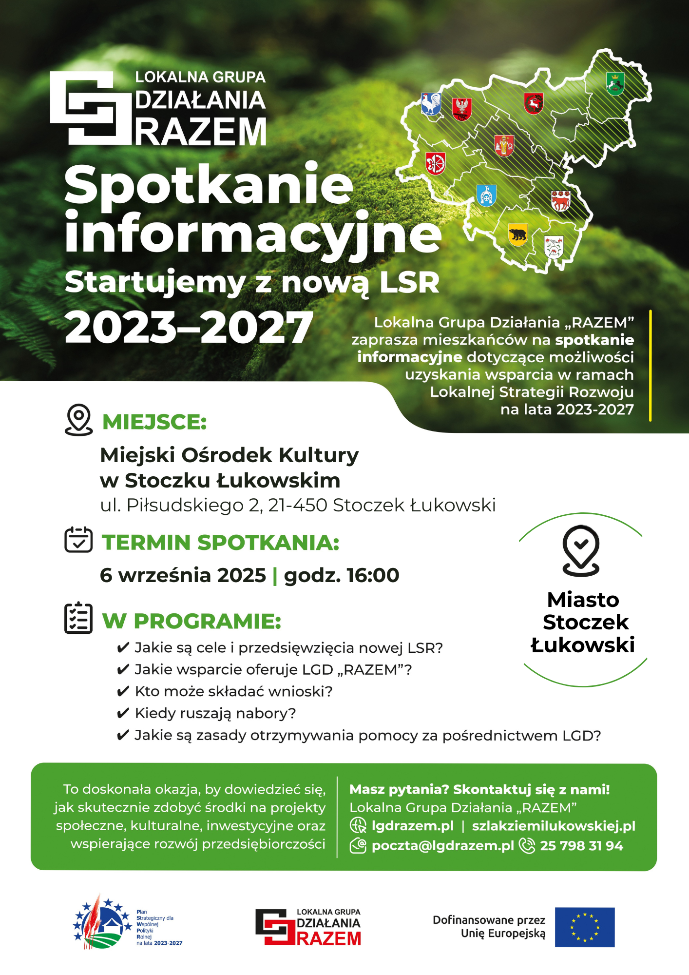 Lokalna Grupa Działania „RAZEM" zaprasza mieszkańców obszaru LGD na spotkanie informacyjne „Startujemy z nową LSR 2023-2027", dotyczące możliwości pozyskania wsparcia w ramach Lokalnej Strategii Rozwoju na lata 2023-2027.